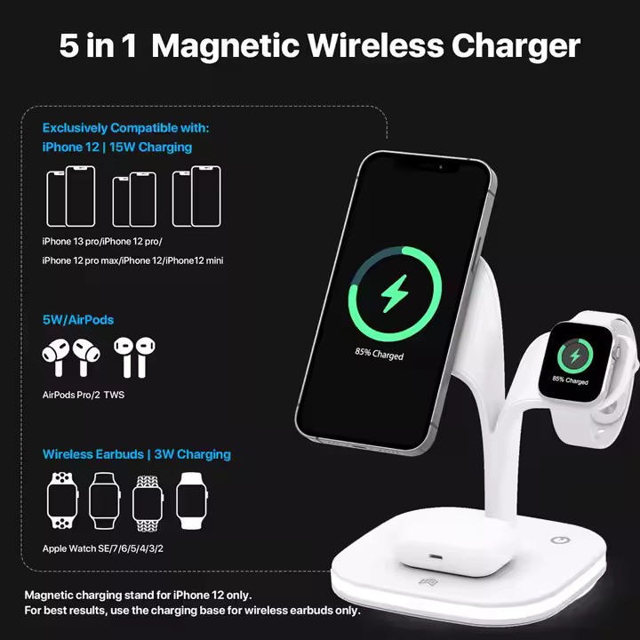 • Multiple Functionality: This 5 in 1 wireless charger is designed to cater to various devices, including iPhone, Android smartphones, AirPods, and smartwatches, making it a convenient solution for users with multiple devices to charge simultaneously.
