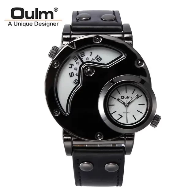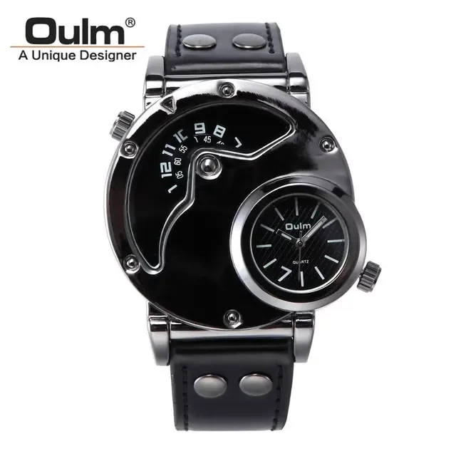 OULM HP9591 Men's Leather Strap Watch with Stainless Steel Case, Big Face and Dual Time Zones