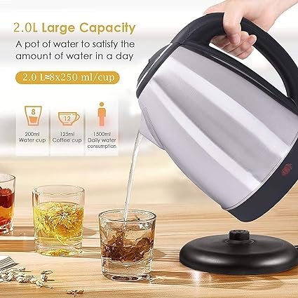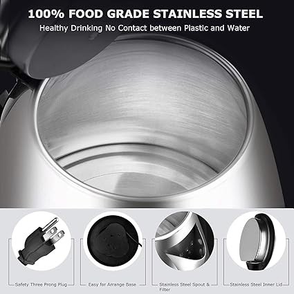 Safe and Durable: The kettle features a heat-resistant plastic handle to prevent burns while handling hot water. The base rotates a full 360 degrees for easy lifting and placing, and the cord conveniently wraps around the base for clutter-free storage.